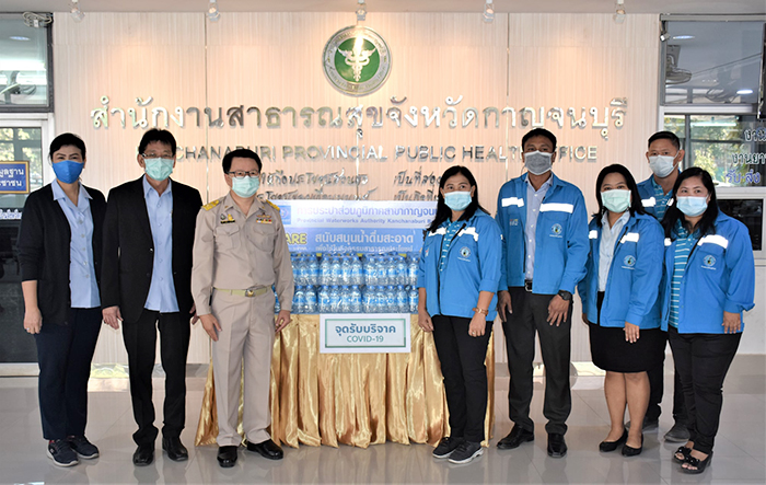 วันที่ 14 มกราคม 2564 ที่ห้องโถงอาคารมัชฌิมาคาร สำนักงานสาธารณสุขจังหวัดกาญจนบุรี นายอนุชา วรหาญ รองนายแพทย์สาธารณสุขจังหวัดกาญจนบุรี พร้อมด้วย นายวิสิทธิ์ ปิ่นประชานันท์ รองนายแพทย์สาธารณสุขจังหวัดกาญจนบุรี และหัวหน้ากลุ่มงานควบคุมโรคติดต่อ สำนักงานสาธารณสุขจังหวัดกาญจนบุรี เป็นตัวแทนรับมอบน้ำดื่ม จำนวน 300 ขวด จากการประปาส่วนภูมิภาค จังหวัดกาญจนบุรี เพื่อนำไปใช้ประโยชน์กับทีมปฏิบัติงานเชิงรุกในการป้องกันและควบคุมโรคในพื้นที่ และคณะกรรมการตรวจประเมินสถานประกอบการระดับจังหวัด ศูนย์ป้องกันการแพร่ระบาด COVID-19 สำนักงานสาธารณสุขจังหวัดกาญจนบุรีขอขอบคุณมา ณ โอกาสนี้