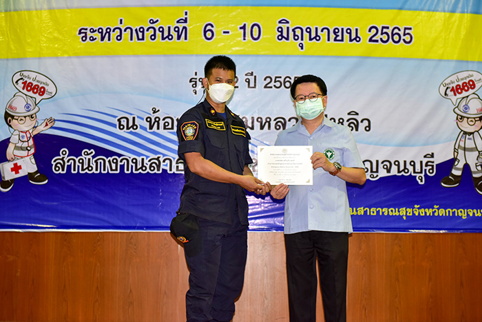 วันที่ 10 มิถุนายน 2565 เวลา 16.30 น. ที่ห้องประชุมอาคารหลวงปู่หลิว สำนักงานสาธารณสุขจังหวัดกาญจนบุรี นายแพทย์ชาติชาย กิติยานันท์ นายแพทย์สาธารณสุขจังหวัดกาญจนบุรี มอบหมายให้นายอนุชา วรหาญ รองนายแพทย์สาธารณสุขจังหวัดกาญจนบุรี เป็นประธานกล่าวปิดการอบรม และมอบประกาศนียบัตรให้ผู้ผ่าน”การอบรมอาสาสมัครฉุกเฉินการแพทย์ (EMR)"รุ่นที่ 2 ปี 2565 หลักสูตรอบรม 5 วัน ระหว่างวันที่ 6-10 มิถุนายน 2565 โดยมีทีมคณะวิทยากรให้ความรู้จาก โรงพยาบาลทองผาภูมิ โรงพยาบาลมะการักษ์ โรงพยาบาลไทรโยค โรงพยาบาลท่ากระดาน และโรงพยาบาลบ่อพลอย ให้เกียรติเป็น ผู้เข้ารับการอบรมประกอบด้วยเจ้าหน้าที่กู้ชีพของมูลนิธิและองค์กรปกครองส่วนท้องถิ่น (อปท.) ในจังหวัดกาญจนบุรี จำนวน 30 คน โดยอาสาสมัครฉุกเฉินการแพทย์ถือเป็นบุคลากรในทีม ที่มีบทบาทสำคัญต่อความสำเร็จในการช่วยเหลือผู้ป่วย เนื่องจากเป็นทีมที่สามารถเข้าถึงและให้การช่วยเหลือผู้ป่วยเบื้องต้นได้อย่างรวดเร็ว ทั้งนี้การมีทักษะ ความรู้ทางทฤษฎี และวิธีการปฏิบัติที่ถูกต้องจะเสริมสร้างความมั่นใจให้กับผู้ป่วยและญาติ และมีความพร้อมในการตั้งรับสถานการณ์ฉุกเฉิน สำหรับการดูแลผู้ป่วยได้อย่างมีประสิทธิภาพ