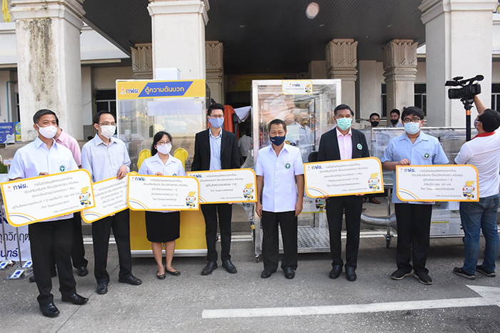 วันที่ 12 พฤษภาคม 2563 ที่บริเวณห้องโถง ศาลากลางจังหวัดกาญจนบุรี นายจีระเกียรติ ภูมิสวัสดิ์ ผู้ว่าราชการจังหวัดกาญจนบุรี พร้อมด้วย นพ.นิพนธ์ พัฒนกิจเรือง นายแพทย์สาธารณสุขจังหวัดกาญจนบุรี รับมอบอุปกรณ์ทางการแพทย์ ตู้เก็บสิ่งส่งตรวจความดันลบ (Negative Pressure) จำนวน 5 ตู้ จากการไฟฟ้าฝ่ายผลิตแห่งประเทศไทย (กฟผ.) เขื่อนศรีนครินทร์ เพื่อส่งมอบต่อให้โรงพยาบาลสมเด็จพระสังฆราช องค์ที่ 19 โรงพยาบาลศุกร์ศิริศรีสวัสดิ์ โรงพยาบาลท่ากระดาน โรงพยาบาลทองผาภูมิ และโรงพยาบาลสังขละบุรี